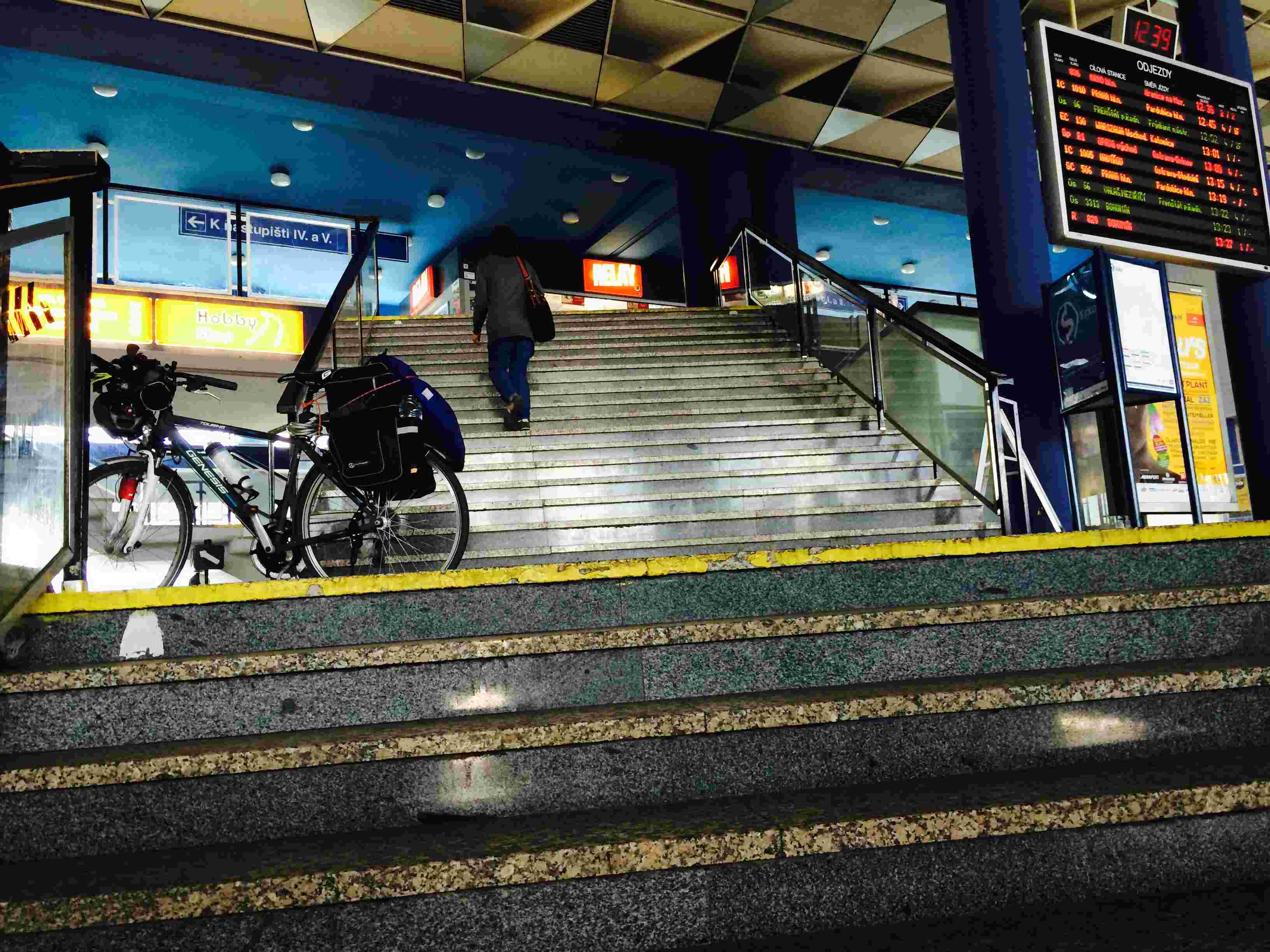 No coż , należy mi się skoro dzięki mnie upadł komunizm w Czechach… Zmęczony tą grą zdecydowałem się na przeskoczenie do Pragi. Wspaniałe doświadczenie: pednolino, WIFI, czeskie piwo… i po trzech godzinach już w Pradze. To wszystko za jedyne 330 Kc czyli ok 14 EURO. Zanim jednak mogłem tego zasmakować zobaczcie sami czy nie byłem prześladowany przez czeskie służby, poniżej zdjęcie wejścia na perony w Ostravie. Jak w takiej sytuacji mają zachować się ludzie na wózkach inwalidzkich ? Dla mnie to tylko bezsensowny i trochę niebezpieczny wysiłek, dla nich droga nie do pokonania.