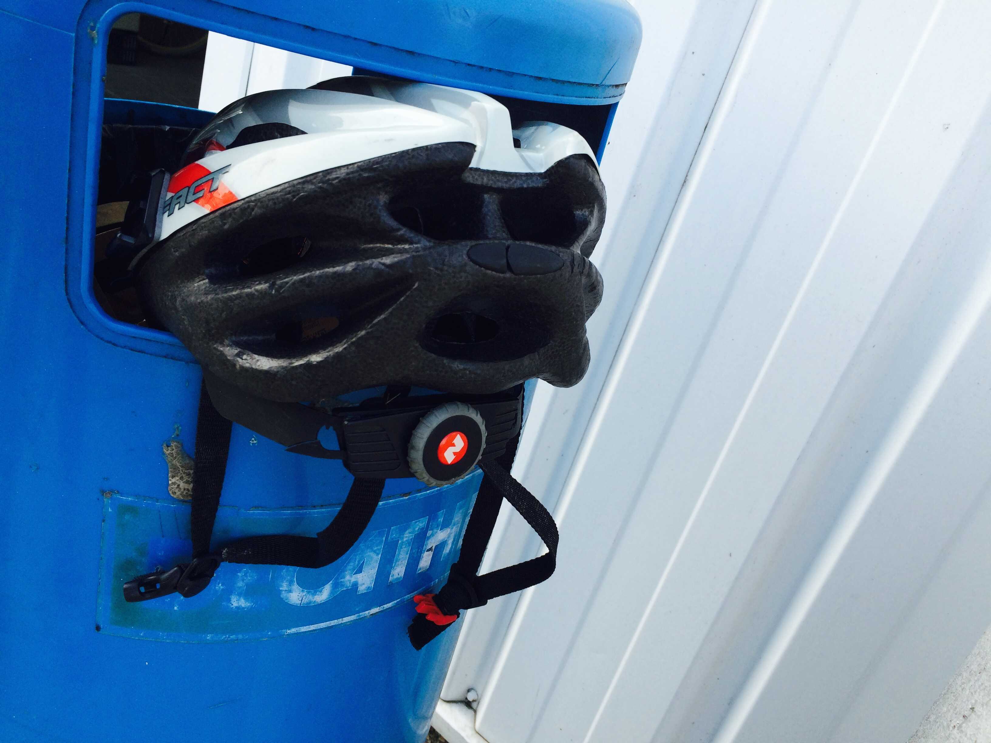 Następnym razem postaram się dać jakąś listę niezbędnych rzeczy ale jeszcze kilka muszę kupić i kilka wyrzucić z mojego ekwipunku. Wtedy będzie ta lista bardziej przydatna… Poniżej zdjęcie wyrzuconego kasku po małej kraksie z wózkiem przy Centrum Handlowym 🙂 Nie było groźnie ale jajka potłuczone. Szkoda , że nie było czasu na zdjęcie jajek. A wszystko zaczęło się od ziut, ziut, nie naprawiłem na czas i regulując błotnik wpadłem na niewinną niewiastę, której obcy był smak czekolady , gdyż koncert rockowy nie robi tyle hałasu co jej lament o karton jajek. A moje, w porządku, dziękuję bez większego uszczerbku tyle że zarysowane i kolorowe jak kraszanki na Święta Wielkanocne